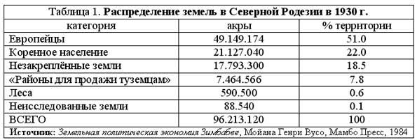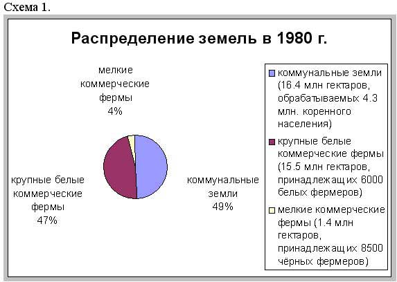 Более того, расистский режим белого меньшинства, сперва создав в резервациях условия перенаселённости и хозяйственного упадка, используя политику сегрегации и жестокого ограбления, затем обвинил в этом африканцев. Именно это и гласит Акт о туземном земледелии 1951 г., выпущенный с целью заставить африканцев принимать меры по сохранению их земель – меры, принять которые не позволяли условия их существования. Ужасное положение перенаселённых резерваций обеспокоило даже католическую церковь, и в 1959 г. Донал Ламонт, епископ Умтали, был вынужден спросить: «Можно ли сознательно обвинять африканцев, если, влача жалкое существование на бедных почвах перенаселённых резерваций, они подвергаются воздействию гибельной пропаганды, в то время как рядом с ними – сотни тысяч гектаров плодородных земель, которые он не может ни занимать, ни возделывать, потому что хотя она остаётся необрабатываемой и непосещаемой, она принадлежит какому-то лицу или группе лиц, которые, возможно, не используют землю в надежде на получение прибыли от перепродажи?» Правительство Родезийского фронта. Таким образом, видно, что для населения Зимбабве потеря земель не является делом далёкого прошлого. Для многих людей это произошло на их памяти. В то же время многие белые фермеры получили огромные территории после Второй мировой войны в ознаменование их военных заслуг. Пета Торникрофт и Дорис Лессинг – дочери офицеров, которым досталась эта земля. Вторая Чимуренга. Оно началось против грабительской системы, против насилия в перенаселённых резервациях с почти полным отсутствием образования и медицинской помощи, против положения лишних в собственной стране, чтобы положить конец адским условиям существования, в то время как незначительное белое меньшинство купалось в роскоши, эксплуатируя народные массы Зимбабве, и под руководством АНСЗ началась Вторая Чимуренга. Основной целью этой освободительной борьбы была земля – помимо достижения политической независимости, возврат африканцам земли, отобранной у них под дулами ружей кучкой колонистов. «Мвана Вевху» («Сын земли») был рупором объединённых националистов в годы, предшествовавшие Второй Чимуренге. Герберт Читепо, национальный председатель АНСЗ, с его удивительной способностью попадать не в бровь, а в глаз, писал: «Я мог углубляться в теории дискриминации, в юридические и политические аспекты, в экономические возможности, проблемы образования. Я мог углубляться в эти вопросы, но я ограничусь вопросом о земле, поскольку считаю его основным. Для нас суть эксплуатации, суть главенства белых – во владении землёй. Такова реальность» (Герберт Читепо, Речь во время поездки в Австралию, 1973). Вопрос о земле был самым важным, потому все попытки решить зимбабвийскую проблему, не касаясь этого вопроса, постигла неудача. Провал Женевской конференции в 1976 г. и Мальтийских переговоров в 1978 г. легко объясняется неспособностью решить эту проблему. Без понимания этого вопроса Ланкастерская конференция разделит судьбу предыдущих попыток и закончится провалом. Первая попытка учесть реальное положение дел была предпринята в 1977 г. правительствами США и Великобритании, когда Министр иностранных дел Великобритании доктор Дэвид Оуэн и представитель США в ООН Эндрю Янг представили англо-американские предложения, сопровод